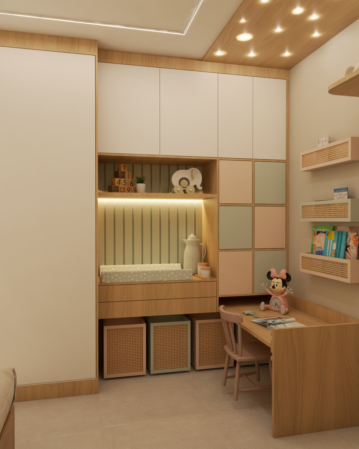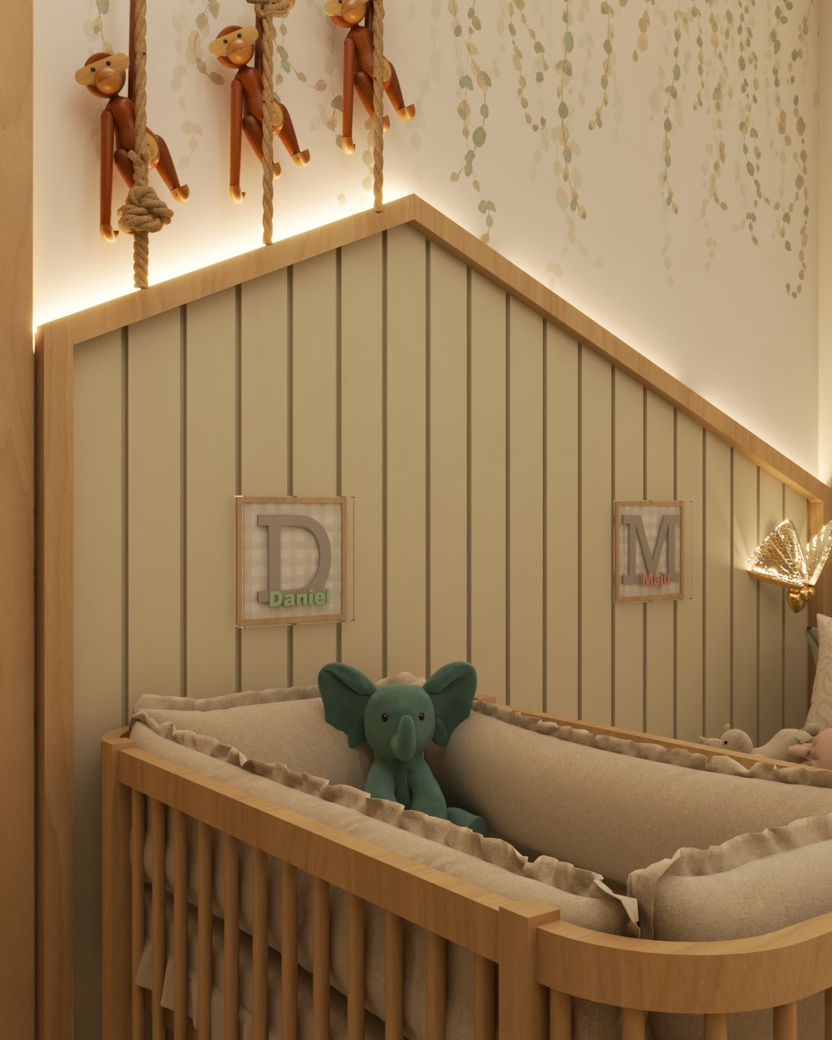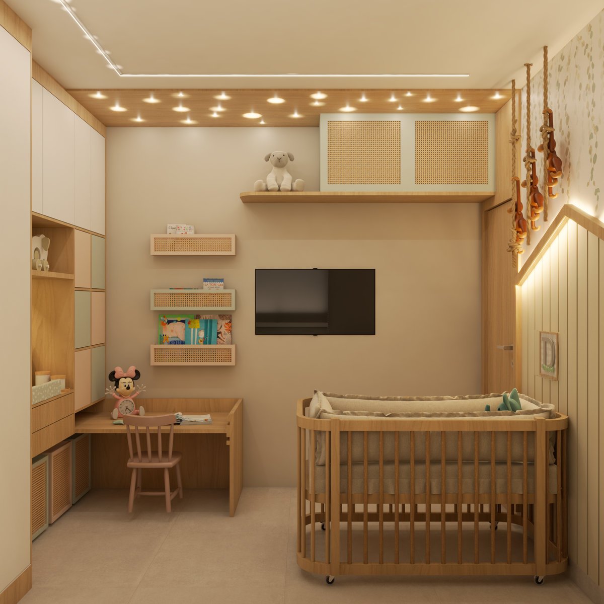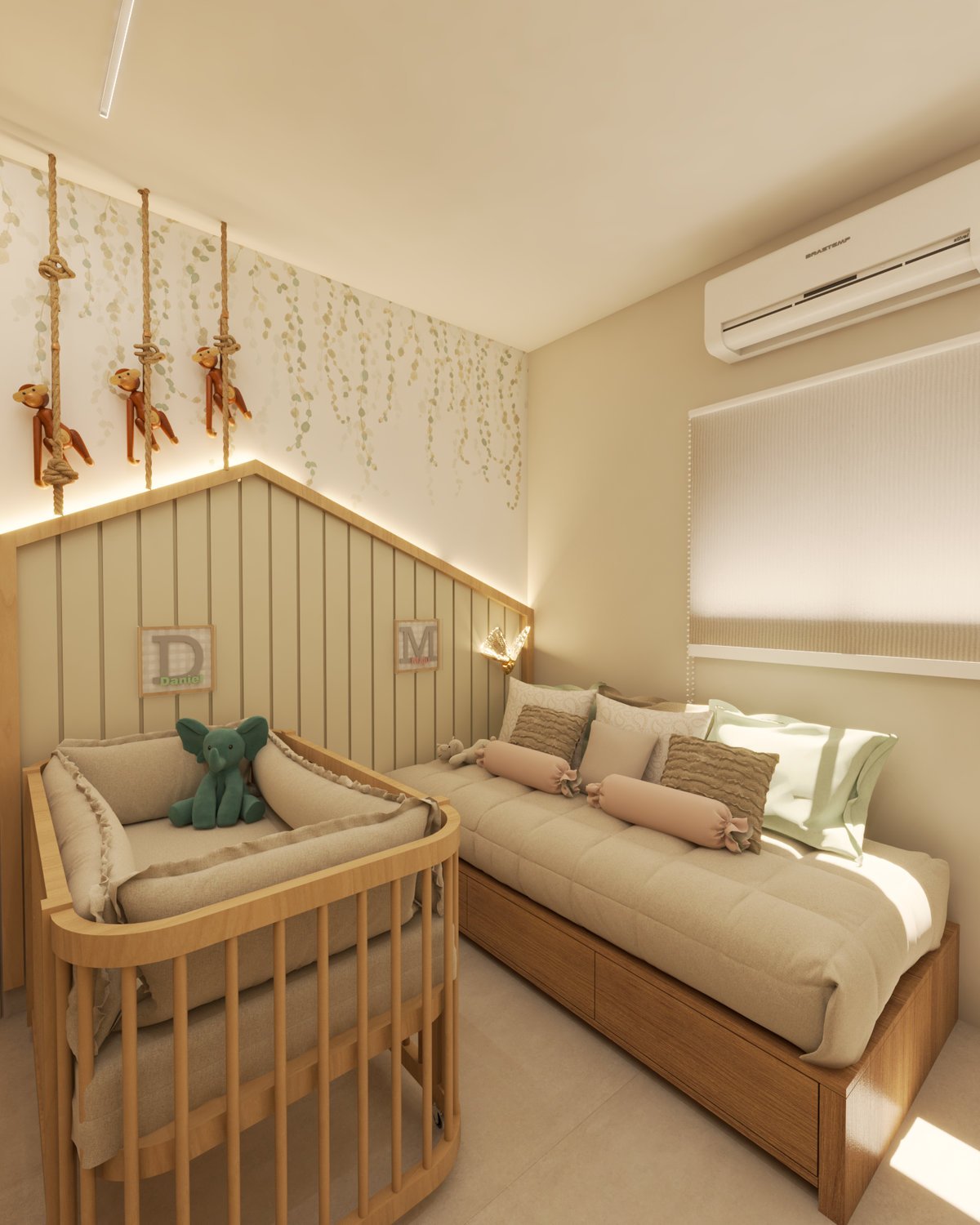 Este quarto de irmãos foi planejado para unir funcionalidade e encanto em um só espaço. A marcenaria em madeira clara aquece o ambiente, enquanto o detalhe lúdico da parede em formato de casinha, com iluminação embutida, traz aconchego e personalidade. O berço e a cama dividem o ambiente de forma harmoniosa, criando um espaço acolhedor para ambos.
