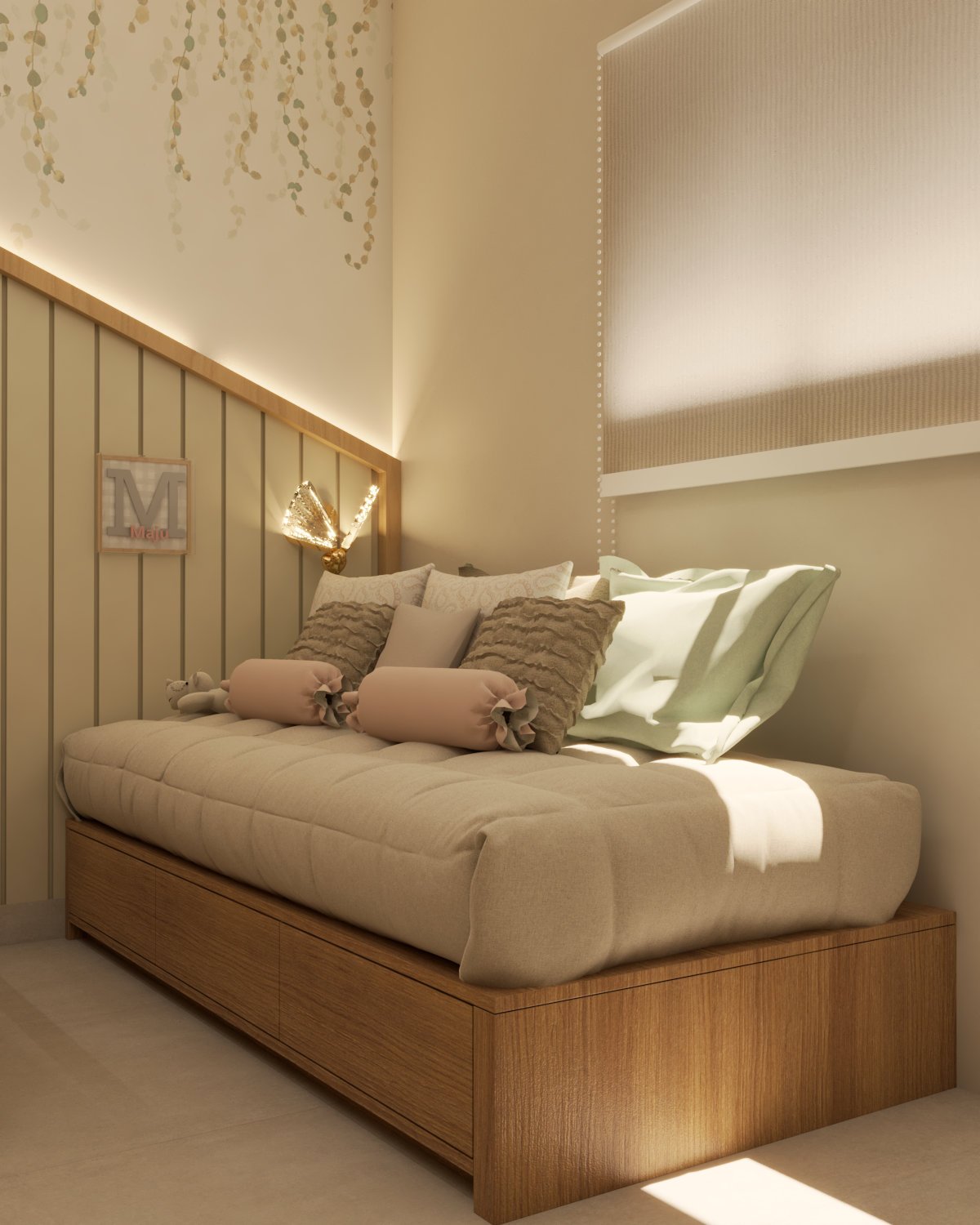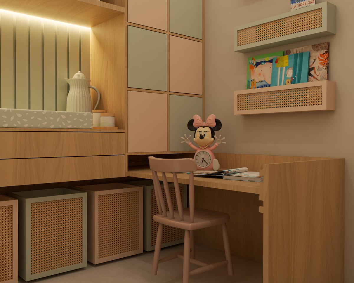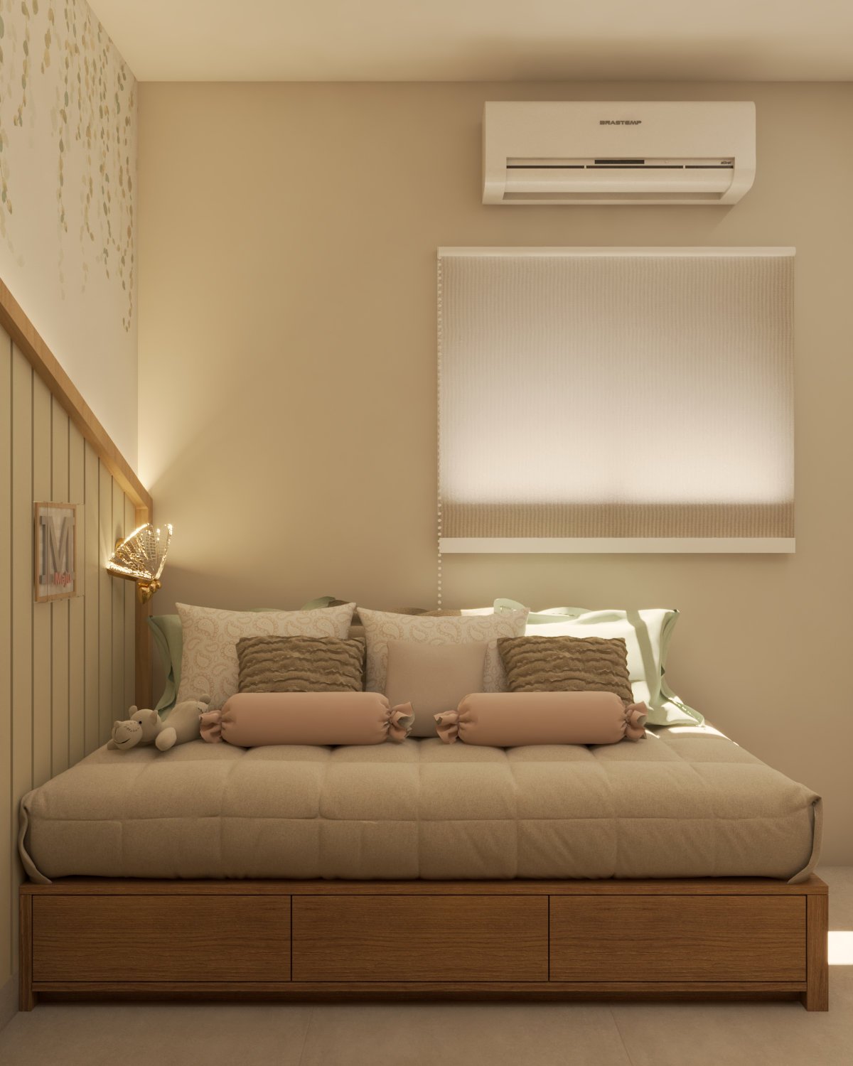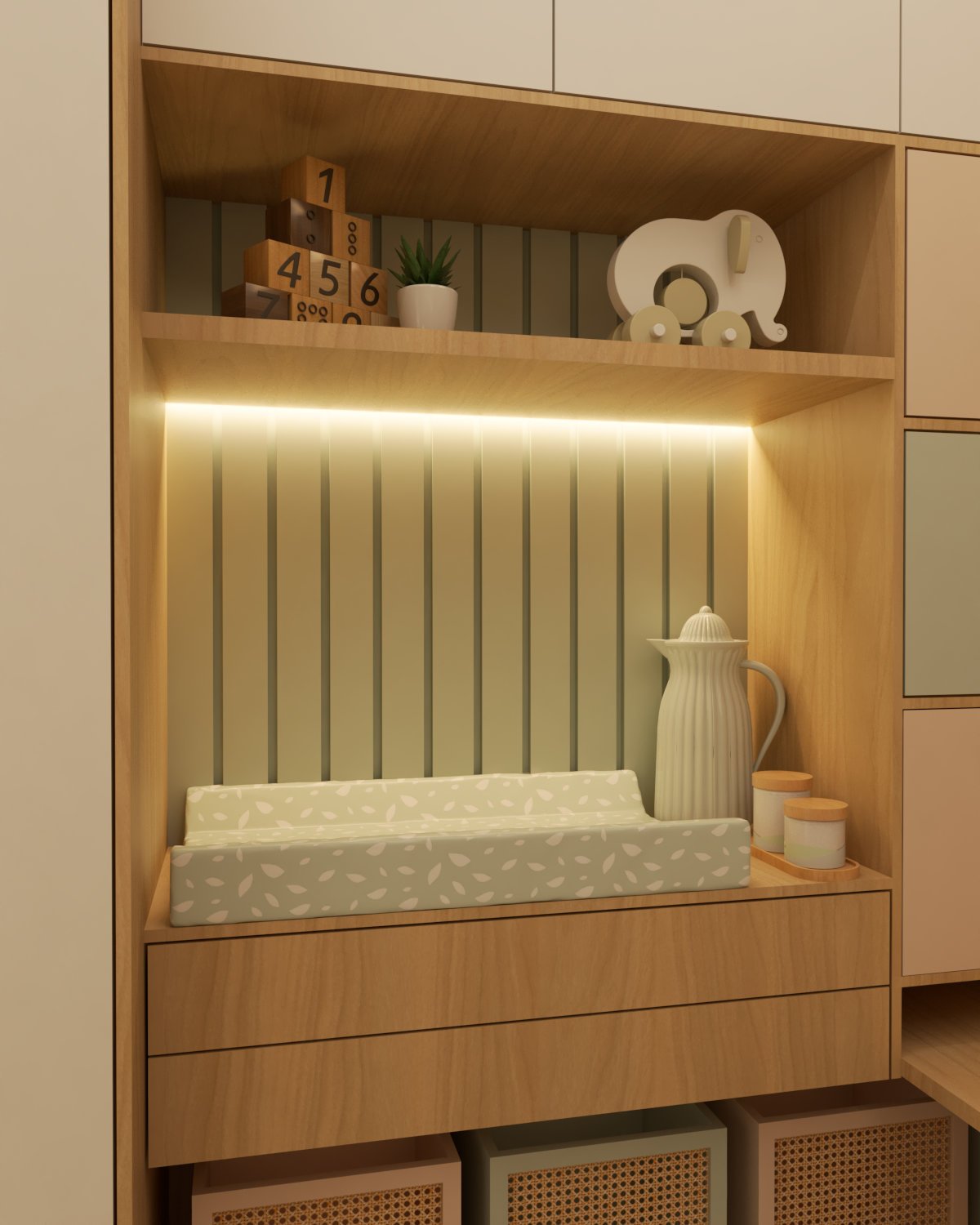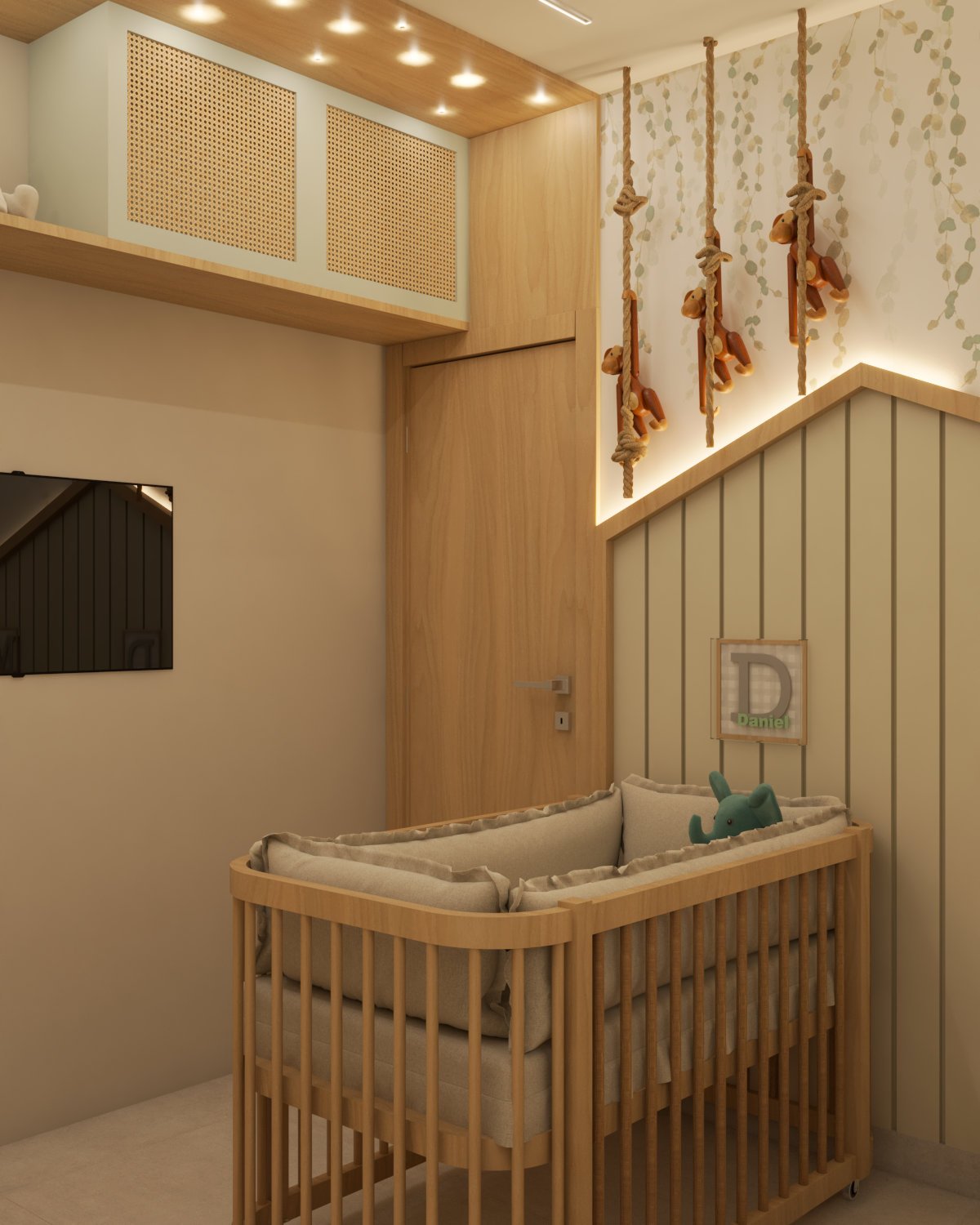 Este quarto de irmãos foi planejado para unir funcionalidade e encanto em um só espaço. A marcenaria em madeira clara aquece o ambiente, enquanto o detalhe lúdico da parede em formato de casinha, com iluminação embutida, traz aconchego e personalidade. O berço e a cama dividem o ambiente de forma harmoniosa, criando um espaço acolhedor para ambos.