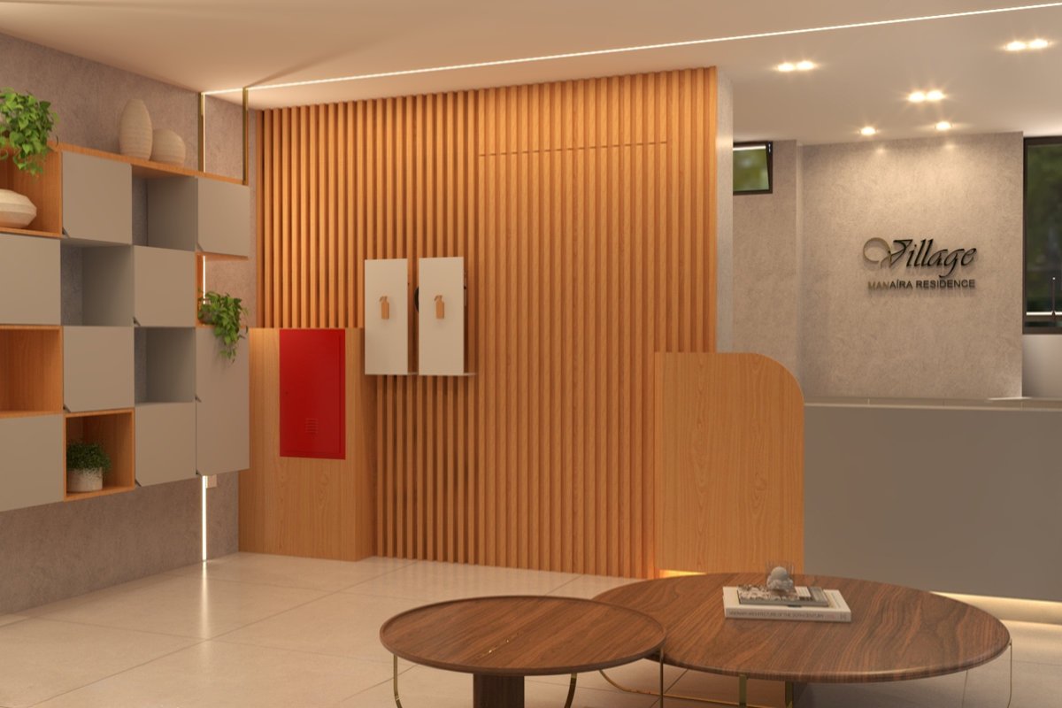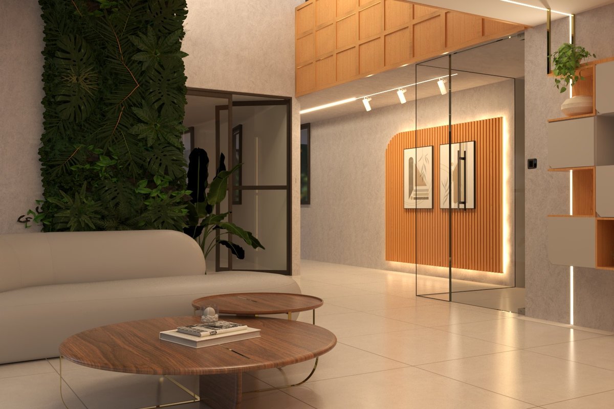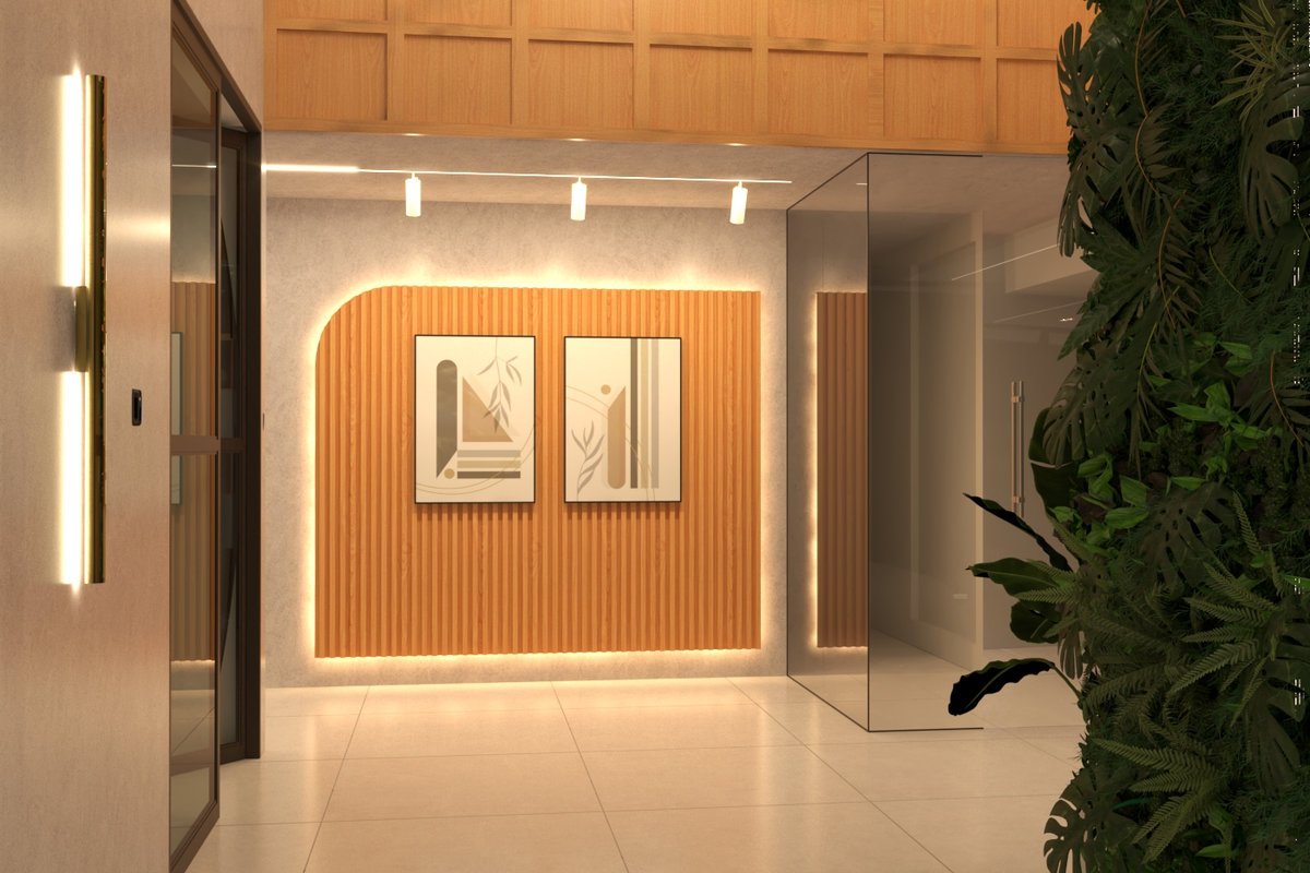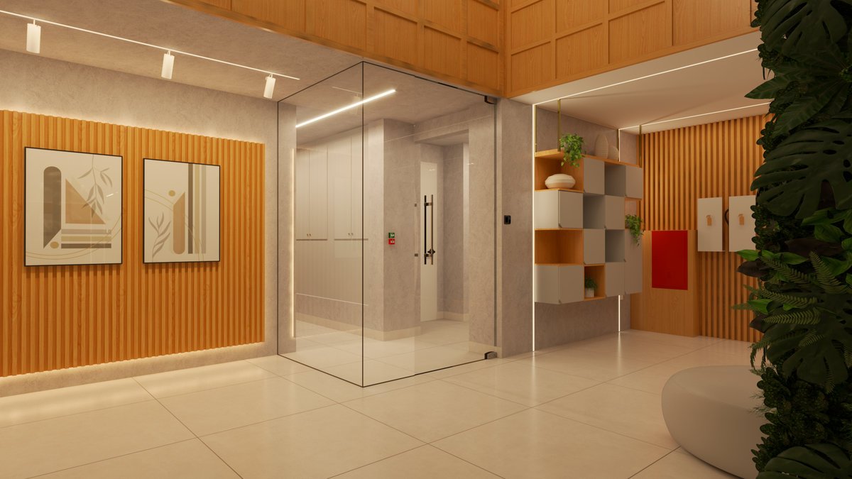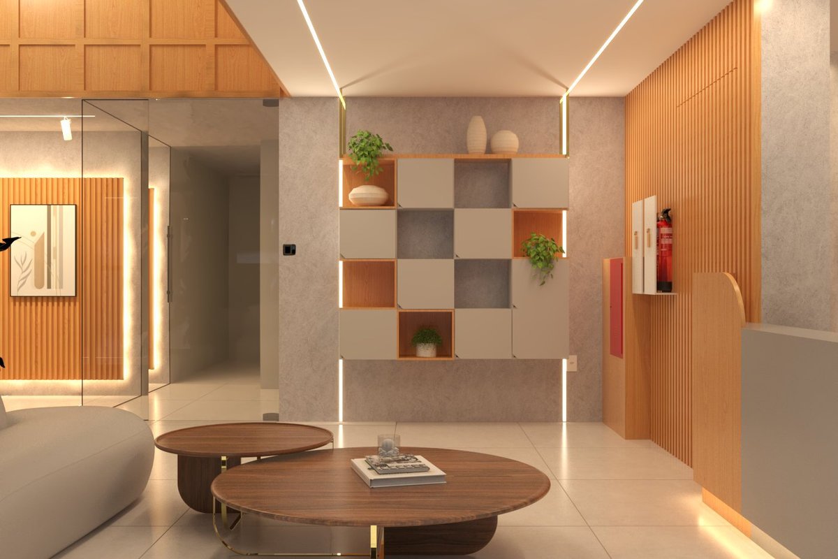 Esse projeto de recepção combina modernidade e acolhimento, com revestimentos em madeira ripada, iluminação indireta e detalhes em concreto aparente que transmitem sofisticação. O uso de verde natural e estantes decorativas suaviza o ambiente, criando equilíbrio entre elegância e bem estar. Um espaço que valoriza tanto a estética quanto a sensação de conforto para os moradores e visitantes