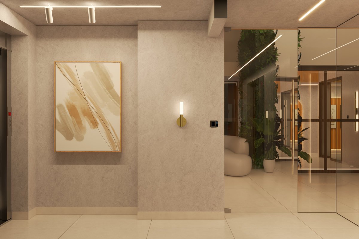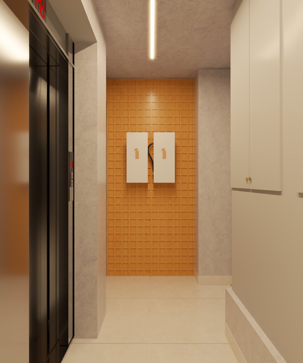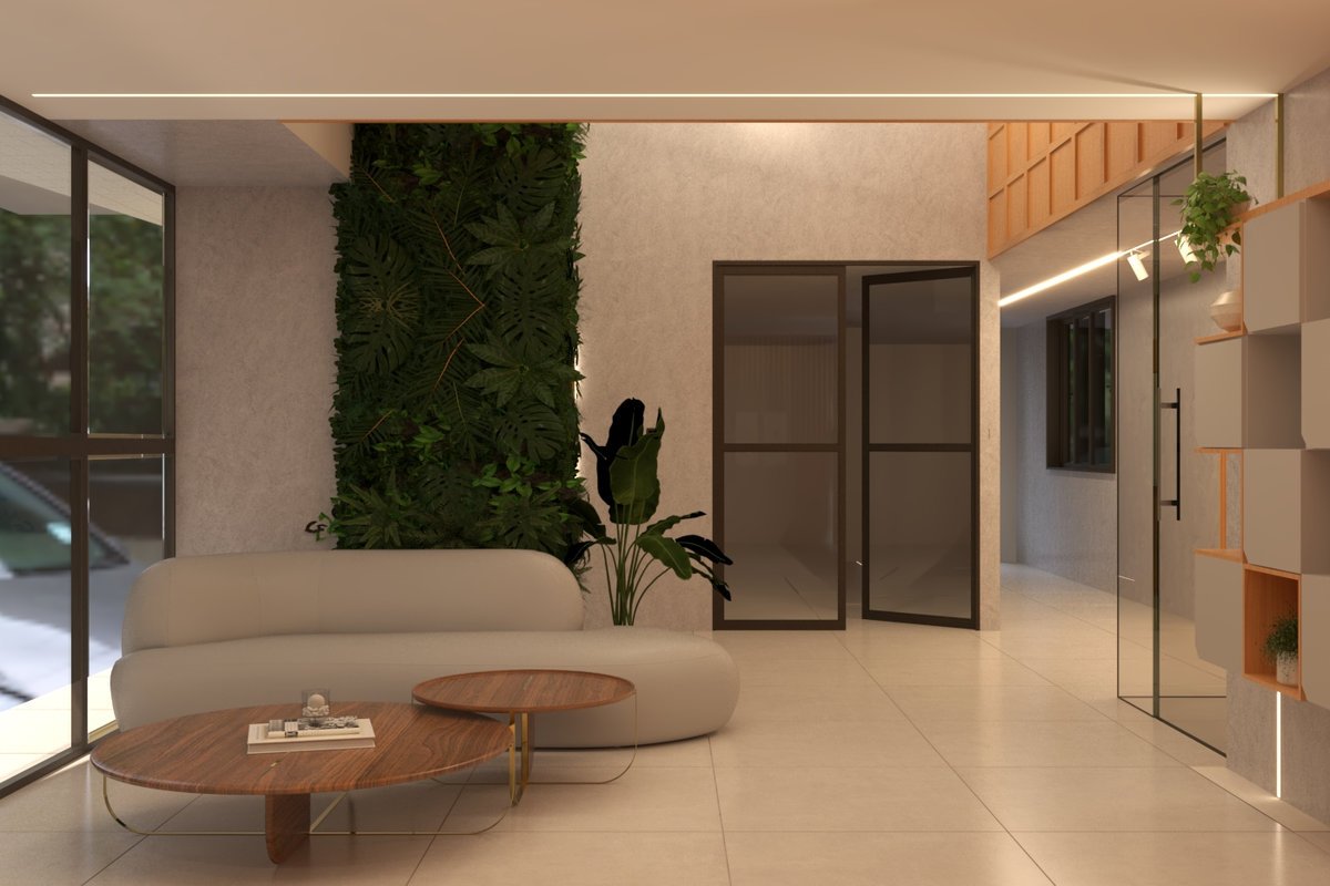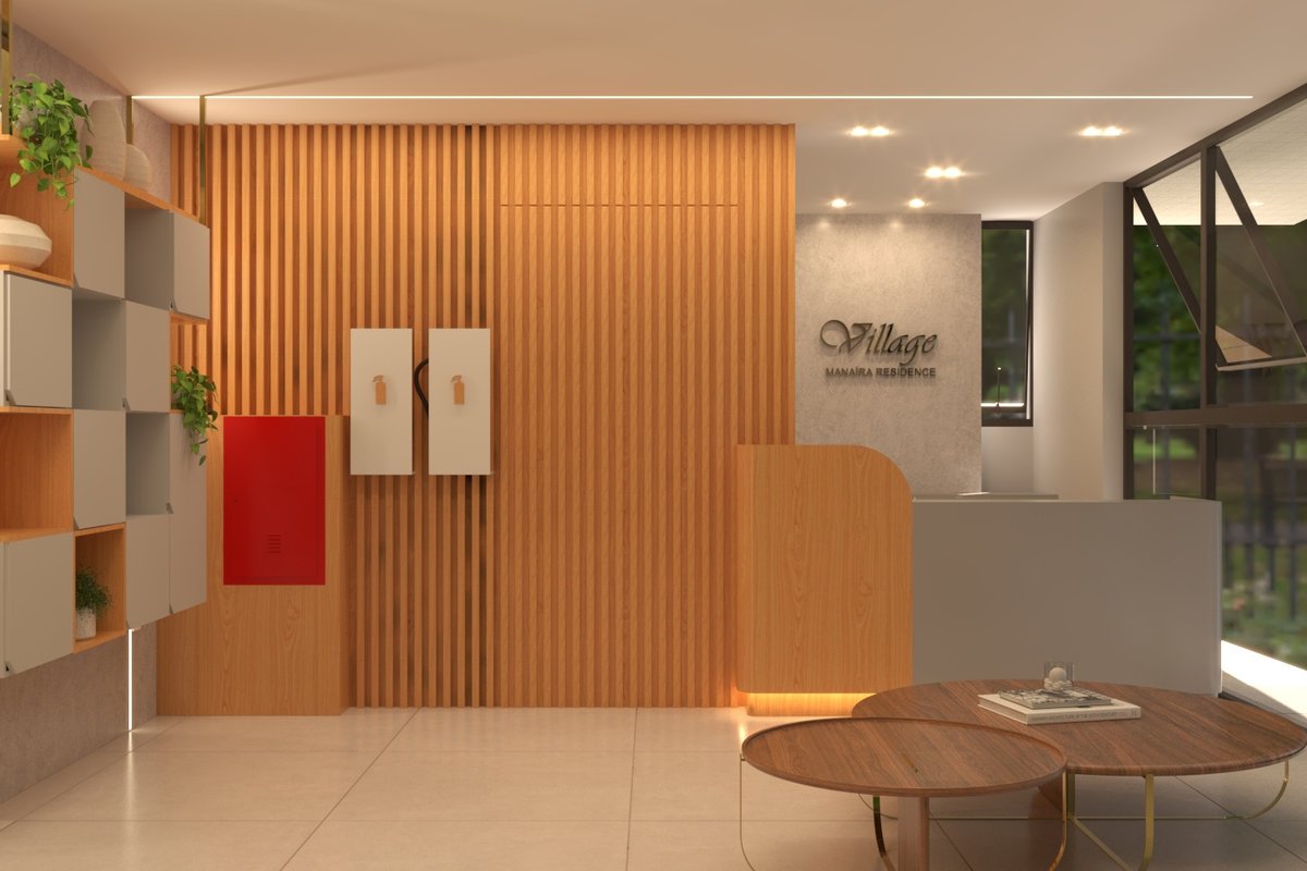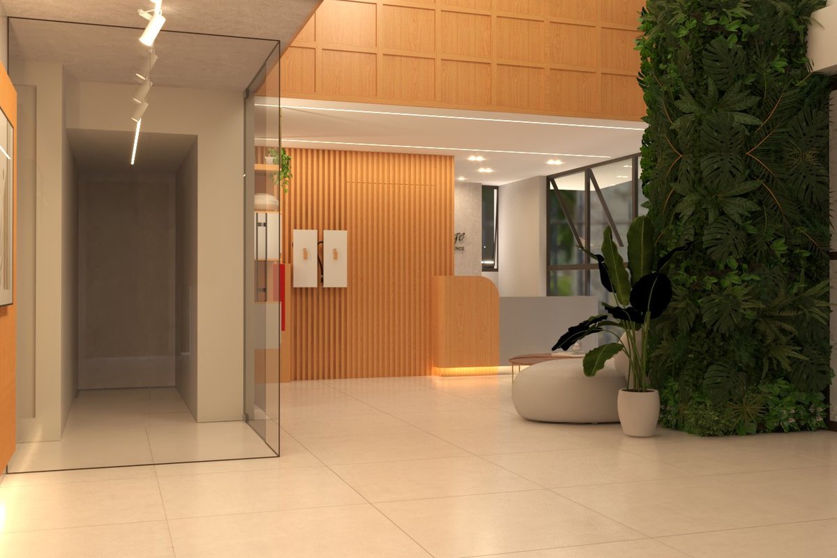 Esse projeto de recepção combina modernidade e acolhimento, com revestimentos em madeira ripada, iluminação indireta e detalhes em concreto aparente que transmitem sofisticação. O uso de verde natural e estantes decorativas suaviza o ambiente, criando equilíbrio entre elegância e bem estar. Um espaço que valoriza tanto a estética quanto a sensação de conforto para os moradores e visitantes