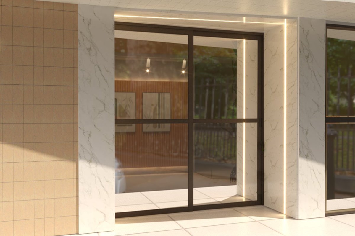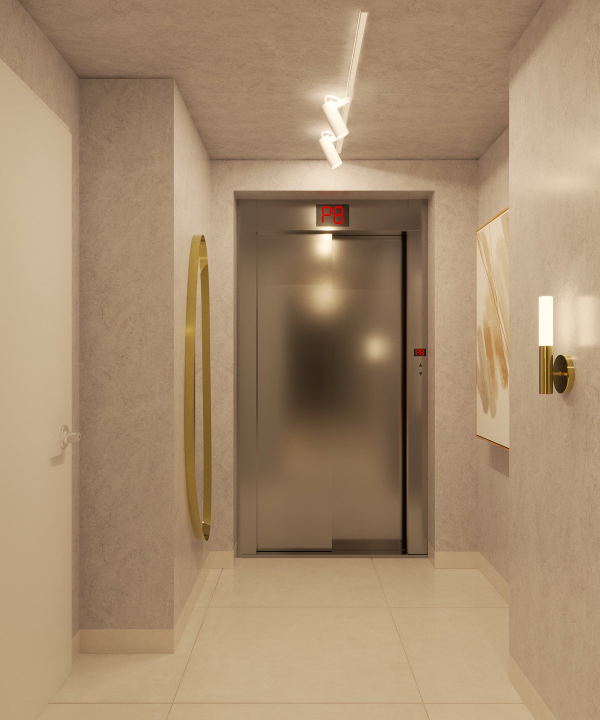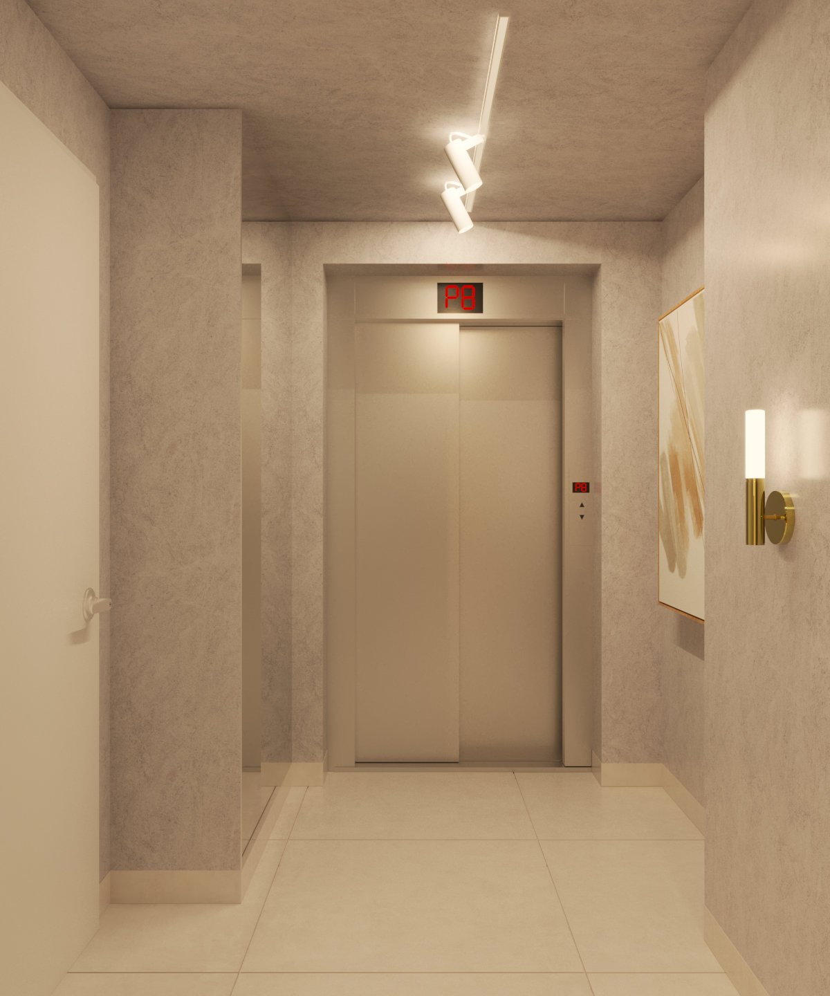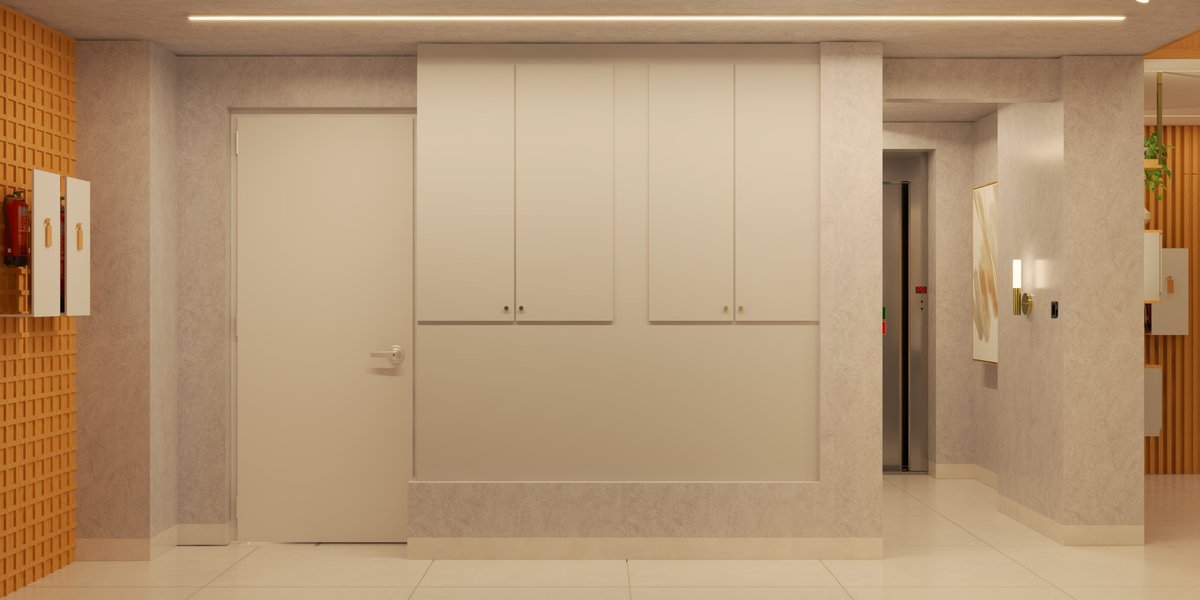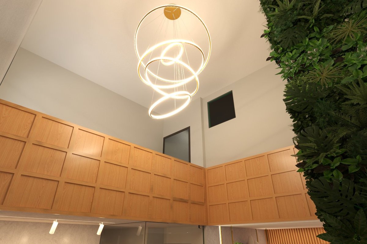 Esse projeto de recepção combina modernidade e acolhimento, com revestimentos em madeira ripada, iluminação indireta e detalhes em concreto aparente que transmitem sofisticação. O uso de verde natural e estantes decorativas suaviza o ambiente, criando equilíbrio entre elegância e bem estar. Um espaço que valoriza tanto a estética quanto a sensação de conforto para os moradores e visitantes